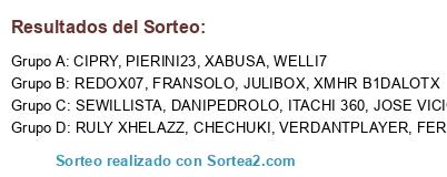 Lista de participantes: REDOX07, JOSE VICIO, SEWILLISTA, XABUSA, FERNANDOLH11, XMHR B1DALOTX, JULIBOX, PIERINI23, VERDANTPLAYER, RULY XHELAZZ, DANIPEDROLO, WELLI7, FRANSOLO, CHECHUKI, ITACHI 360, CIPRY.