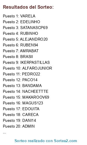 Lista de participantes: ADMIN, PEDRO22, IKERPASTILLAS, ALEJANDRO20, EDELINHO, ALEEX, BRASII, NACHEETTTE, RUBINHO, PACO14, MAGUS123, SATANASCP69, RUBEN94, KILATE01, PAKIU12, MAKAROOV69, BANDAMA, CARECA, VARELA, AMRABAT, DANI14, EDOUITA, ALFAROJUNIOR.