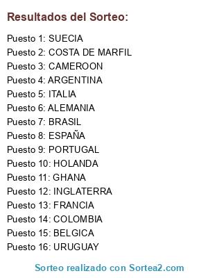 Lista de participantes: ESPAÑA, FRANCIA, ITALIA, INGLATERRA, ALEMANIA, BRASIL, ARGENTINA, URUGUAY, COLOMBIA, HOLANDA, COSTA DE MARFIL, PORTUGAL, BELGICA, SUECIA, GHANA, CAMEROON.
