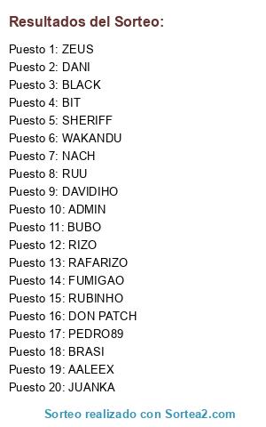 Lista de participantes: ADMIN, BUBO, RIZO, FUMIGAO, ZEUS, DANI, DON PATCH, RUBINHO, BIT, AALEEX, BLACK, BRASI, WAKANDU, RUU, RAFARIZO, JUANKA, SHERIFF, NACH, PEDRO89, DAVIDIHO.
