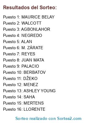 Lista de participantes: M. ZÁRATE, REYES, WALCOTT, ASHLEY YOUNG, DŽEKO, MAURICE BELAY, ALAN, AGBONLAHOR, MENEZ, JUAN MATA, MERTENS, PALACIO, BERBATOV, NEGREDO, SAHA, LLORENTE, .