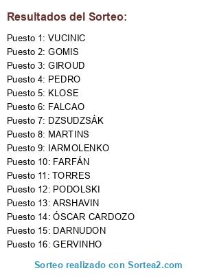 Lista de participantes: VUCINIC, FALCAO, DZSUDZSÁK, FARFÁN, KLOSE, PEDRO, MARTINS, GOMIS, ARSHAVIN, IARMOLENKO, GIROUD, DARNUDON, PODOLSKI, ÓSCAR CARDOZO, GERVINHO, TORRES, .