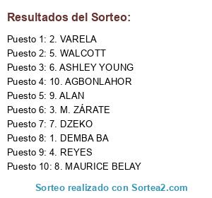 Lista de participantes: 1. DEMBA BA, 2. VARELA, 3. M. ZÁRATE, 4. REYES, 5. WALCOTT, 6. ASHLEY YOUNG, 7. DZEKO, 8. MAURICE BELAY, 9. ALAN, 10. AGBONLAHOR.