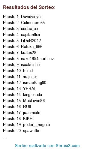 Lista de participantes: LiDeR2012, Davidyinyer, Colmenero85, romapro, kratos28, majeitor, poder__negrito, MacLovin86, Juanma, capitanflipi, ismaelking90, cortex_xx, huied, juanmiole, Rafuka_666, kinglosada, spawntfe, YERAI, RUII, KIKE, naxo1994martinez, isaakcinho.