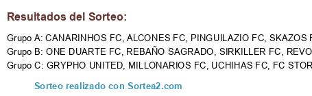 Lista de participantes: SIRKILLER FC, UCHIHAS FC, GRYPHO UNITED, ALCONES FC, CANARINHOS FC, MILLONARIOS FC, FC STORMS, SKAZOS FC, REVOLUTION FC, ONE DUARTE FC, PINGUILAZIO FC, REBAÑO SAGRADO.