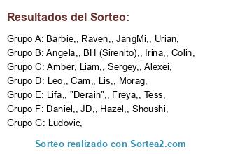 Lista de participantes: Sergey,, Morag,, Leo,, Cam,, Lis,, Freya,, Colin,, Ludovic,, Lifa,, Shoushi,, Irina,, JD,, Raven,, Daniel,, BH (Sirenito),, JangMi,, "Derain",, Barbie,, Tess,, Liam,, Urian,, Alexei,, Hazel,, Angela,, Amber.