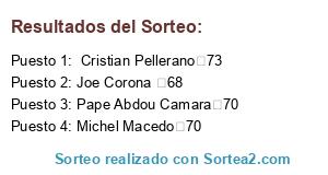 Lista de participantes: S. De Scigilio 77, Ola John 77, Cirilio Saucedo 75, Gandofi 74, Fidel Martinez 74, Duvier Riascos 73, Cristian Pellerano 73, J. Forrest 72, Pape Abdou Camara 70, Michel Macedo 70, F. Arce 70, Joe Corona 68.