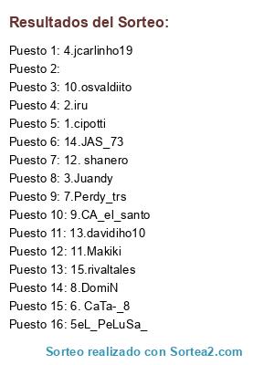 Lista de participantes: 1.cipotti, 2.iru, 3.Juandy, 4.jcarlinho19, 5eL_PeLuSa_, 6. CaTa-_8, 7.Perdy_trs, 8.DomiN, 9.CA_el_santo, 10.osvaldiito, 11.Makiki, 12. shanero, 13.davidiho10, 14.JAS_73, 15.rivaltales, .