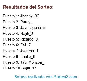 Lista de participantes: Najib_3, Jhonny_32, Javi Laguna_5, Fali_7, Emilio_8, Ricardo_9, Juanma_11, Agui_17, Pardy_, Javi Monzón_.