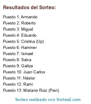 Lista de participantes: Juan Carlos, Salva, Cristina (Up), Armando, Néstor, Roberto, Mariano Ruiz (Pavi), Ismael, Miguel, Hammer, Galtza, Rami, Eduardo.