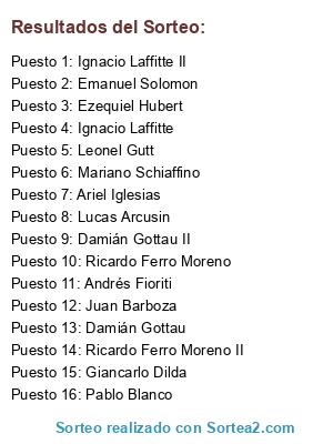 Lista de participantes: Ricardo Ferro Moreno, Ricardo Ferro Moreno II, Emanuel Solomon, Pablo Blanco, Andrés Fioriti, Leonel Gutt, Ignacio Laffitte, Ignacio Laffitte II, Giancarlo Dilda, Ezequiel Hubert, Lucas Arcusin, Damián Gottau, Damián Gottau II, Ariel Iglesias, Mariano Schiaffino, Juan Barboza.
