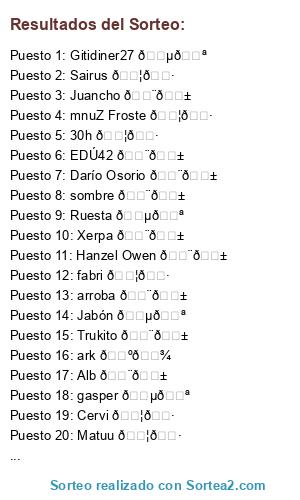 Lista de participantes: EL NENE π¨π±, Sierralta π¨π±, Mata π¨π±, arroba π¨π±, Alb π¨π±, Cif π¨π±, tss π¨π±, Dinamo π¨π±, 30h π¦π·, dance π¦π·, Achraf Hakimi π¨π±, Nanu π¦π·, Ales π¨π±, ark πΊπΎ, cVd Milton π¦π·, Doomposter π¦π·, Lean1 π¦π·, Standly π¨π±, LPDILIXD π΅πͺ, EMPABLO π¨π±, gasper π΅πͺ, LUCAS π΅πͺ, Hairy π¨π±, TheViruz π¨π΄, svavron π¨π±, DarΓo Osorio π¨π±, eleze πΊπΎ, Juancho π¨π±, Falke π¨π±, EDΓ42 π¨π±, JabΓ³n π΅πͺ, Cervi π¦π·, javi π¨π±, sombre π¨π±, α΄Ιͺα΄α΄ ΙͺΙͺΙ΄α΄ π¨π±, Hanzel Owen π¨π±, itam π¨π±, Gitidiner27 π΅πͺ, Ruesta π΅πͺ, Xerpa π¨π±, Trukito π¨π±, El waton π¨π±, SK π¨π±, Bachira π¦π·, Matuu π¦π·, nascar π¨π±, raptor π¦π·, fabri π¦π·, Thiagucho π΅πͺ, Sairus π¦π·, mnuZ Froste π¦π·, Gateto π΅πͺ.
