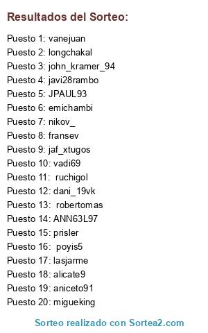 Lista de participantes: jaf_xtugos, vadi69, prisler, nikov_, sucre_95, leluana, wilgisosa, davidjb3, poyis5, alex_1564, migueking, alicate9, javi28rambo, robertomas, fransev, erdidi, dani_19vk, nito95, jiliyo, aniceto91, ruchigol, emichambi, janete7siete, john_kramer_94, vanejuan, longchakal, JPAUL93, ANN63L97, lasjarme.