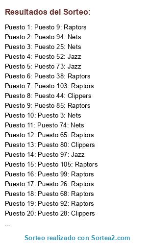 Lista de participantes: Puesto 1: Clippers, Puesto 2: Jazz, Puesto 3: Nets, Puesto 4: Nets, Puesto 5: Raptors, Puesto 6: Raptors, Puesto 7: Nets, Puesto 8: Raptors, Puesto 9: Raptors, Puesto 10: Nets, Puesto 11: Nets, Puesto 12: Clippers, Puesto 13: Jazz, Puesto 14: Clippers, Puesto 15: Raptors, Puesto 16: Raptors, Puesto 17: Raptors, Puesto 18: Raptors, Puesto 19: Raptors, Puesto 20: Nets, Puesto 21: Jazz, Puesto 22: Raptors, Puesto 23: Clippers, Puesto 24: Raptors, Puesto 25: Nets, Puesto 26: Raptors, Puesto 27: Nets, Puesto 28: Clippers, Puesto 29: Jazz, Puesto 30: Nets, Puesto 31: Clippers, Puesto 32: Nets, Puesto 33: Jazz, Puesto 34: Raptors, Puesto 35: Clippers, Puesto 36: Jazz, Puesto 37: Raptors, Puesto 38: Raptors, Puesto 39: Raptors, Puesto 40: Clippers, Puesto 41: Clippers, Puesto 42: Raptors, Puesto 43: Nets, Puesto 44: Clippers, Puesto 45: Raptors, Puesto 46: Nets, Puesto 47: Jazz, Puesto 48: Raptors, Puesto 49: Jazz, Puesto 50: Raptors, Puesto 51: Jazz, Puesto 52: Jazz, Puesto 53: Raptors, Puesto 54: Jazz, Puesto 55: Raptors, Puesto 56: Nets, Puesto 57: Nets, Puesto 58: Raptors, Puesto 59: Raptors, Puesto 60: Raptors, Puesto 61: Nets, Puesto 62: Nets, Puesto 63: Jazz, Puesto 64: Nets, Puesto 65: Raptors, Puesto 66: Nets, Puesto 67: Nets, Puesto 68: Raptors, Puesto 69: Raptors, Puesto 70: Nets, Puesto 71: Raptors, Puesto 72: Clippers, Puesto 73: Jazz, Puesto 74: Nets, Puesto 75: Jazz, Puesto 76: Raptors, Puesto 77: Raptors, Puesto 78: Raptors, Puesto 79: Jazz, Puesto 80: Clippers, Puesto 81: Raptors, Puesto 82: Raptors, Puesto 83: Raptors, Puesto 84: Jazz, Puesto 85: Raptors, Puesto 86: Raptors, Puesto 87: Raptors, Puesto 88: Raptors, Puesto 89: Raptors, Puesto 90: Jazz, Puesto 91: Jazz, Puesto 92: Raptors, Puesto 93: Raptors, Puesto 94: Nets, Puesto 95: Raptors, Puesto 96: Raptors, Puesto 97: Jazz, Puesto 98: Raptors, Puesto 99: Raptors, Puesto 100: Nets, Puesto 101: Raptors, Puesto 102: Raptors, Puesto 103: Raptors, Puesto 104: Jazz, Puesto 105: Raptors, Puesto 106: Clippers, Puesto 107: Raptors, Puesto 108: Raptors, Puesto 109: Raptors, Puesto 110: Raptors, Puesto 111: Jazz, Puesto 112: Clippers, Puesto 113: Raptors, Puesto 114: Raptors, Puesto 115: Jazz, Puesto 116: Jazz, Puesto 117: Jazz, Puesto 118: Raptors.