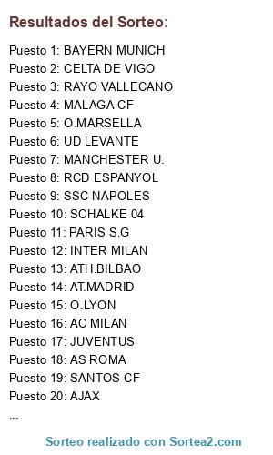 Lista de participantes: INTER MILAN, SSC NAPOLES, PARIS S.G, SANTOS CF, ATH.BILBAO, RAYO VALLECANO, AJAX, DEPORTIVO, BAYERN MUNICH, CELTA DE VIGO, SCHALKE 04, REAL BETIS, JUVENTUS, AT.MADRID, CELTIC GLASGOW, O.LYON, MANCHESTER U., UD LEVANTE, MALAGA CF, RCD ESPANYOL, AS ROMA, AC MILAN, VALENCIA CF, O.MARSELLA.