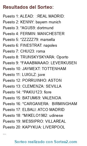 Lista de participantes: MARTINCACERES: :CHELSEA:, ALEAD: :REAL MADRID:, ICAROPUB: BARCELONA, LINHO: CITY, FERMIN: MANCHESTER, RIKEL: inter, CARLOSBODE: ARSENAL, KENNY: bayern munich, LAPETRACRITERS: milan, JAYMEXT: TOTTENHAM, KAPYKUA: LIVERPOOL, FINESTRAT: napoles, XEMITA: O.LYON, PORRUINHO: ASTON, ELBALI: ATCO MADRID, LUIGLZ: juve, MESSIPRO: VILLAREAL, CHUI23: roma, BATUM69: VALENCIA, TRUNSKYSKYARA: Oporto, CLEMENZA: SEVILLA, DAVIDYJOSE: EVERTON, *FAAABMAAAO: LEVERKUSEN, *CARGANERA: BIRMINGHAM, *PABLO VERGUERO: hamburgo, *AGUS9: dortmund, *ZZZZZ79: marsella, *RICRE_5: BILBAO, *MIKELO1982: udinese, *DOMIWANKENOBY: benfica, *PAKIU123: fiore, *ERYX: zenit.