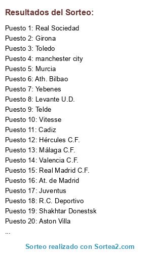 Lista de participantes: Toledo, Real Sociedad, R.C. Deportivo, At. de Madrid, Málaga C.F., Parma, Arsenal, Vitesse, manchester city, FC Porto, Real Madrid C.F., Shakhtar Donestsk, Gremio, Nacional, Aston Villa, Hércules C.F., Liverpool, Swansea City, River Plate, Cadiz, Titan, Girona, Murcia, Juventus, Valencia C.F., Telde, Levante U.D., Betis, Xerez, Ath. Bilbao, Las Palmas, Yebenes.