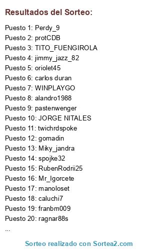 Lista de participantes: gomadin, manoloset, ninolg18, protCDB, Miky_jandra, carlos duran, jag10classics, Mgs_f16, daniAyerza, Perdy_9, WINPLAYGO, JORGE NITALES, twichrdspoke, el_chele_, fergc4, DanielSan81, gatokill_2103, felipe01, spojke32, ExOn_ToGa__10, ragnar88s, RubenRodrii25, jimmy_jazz_82, alandro1988, CAPACHAO, bundbatt54, TITO_FUENGIROLA, pastenwenger, franruizonce, Mr_Igorcete, JorgeVM, franbm009, CD_MARCHAMALO, ZORRO86, pekemartin, ElBuenBub1010, caluchi7, sodast, troula01, juanlumatos, oriolet45, Sr_Osquitar.