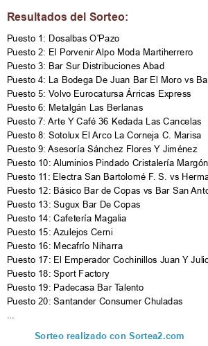 Lista de participantes: Cafetería Magalia, Metalgán Las Berlanas, La Bodega De Juan Bar El Moro vs Bar Los Llanos, Bar Sur Distribuciones Abad, PórticoRural.com ReservasdeTurismo.com, Mecafrío Niharra, El Emperador Cochinillos Juan Y Julio, Taller Mecánico Fernando Hernández, La Villa F. S., Electra San Bartolomé F. S. vs Hermanos Cubero, Fiat Automóviles Cervera, Dosalbas O'Pazo, A. R. Del Río Dep. Alfonso Cincosombreros.es, Aluminios Pindado Cristalería Margón, Cuákero Gran Vía Amadeus, Arte Y Café 36 Kedada Las Cancelas, Volvo Eurocatursa Árricas Express, Básico Bar de Copas vs Bar San Antonio, Jamones Blázquez Crespos, Azulejos Cerni, Sotolux El Arco La Corneja C. Marisa, Asesoría Sánchez Flores Y Jiménez, Sport Factory, Sugux Bar De Copas, El Porvenir Alpo Moda Martiherrero, Padecasa Bar Talento, Taberna Templarios Censenal Servicios, Babel Cochinillos Alfredo Y Luis, Santander Consumer Chuladas, Dolce Vita.