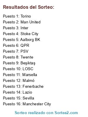 Lista de participantes: QPR, Torino, Beşiktaş, Twente, PSV, Inter, Sevilla, LOSC, Marsella, Aalborg BK, Fenerbache, Stoke City, Malmó, Manchester City, Lazio, Man United.