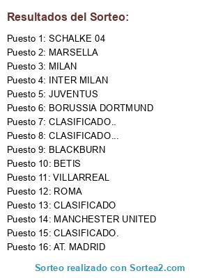 Lista de participantes: BORUSSIA DORTMUND, MARSELLA, AT. MADRID, CLASIFICADO, BLACKBURN, INTER MILAN, SCHALKE 04, CLASIFICADO.., VILLARREAL, JUVENTUS, MILAN, CLASIFICADO., BETIS, MANCHESTER UNITED, ROMA, CLASIFICADO....