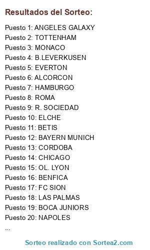 Lista de participantes: AJAX, ALAVES, ALCORCON, ANGELES GALAXY, ARSENAL, AT. MADRID, ATH. BILBAO, B. DORTMUND, B.LEVERKUSEN, BARCELONA, BAYERN MUNICH, BENFICA, BETIS, BOCA JUNIORS, BOURNOMENTH, CELTA, CELTIC, CHELSEA, CHICAGO, CORDOBA, CRISTAL PALACE, ELCHE, EVERTON, FC SION, FIORENTINA, GRANADA, HAMBURGO, JUVENTUS, LAS PALMAS, LAZIO, LEVANTE, LIVERPOOL, M. CITY, M.UNITED, MALAGA, MALMOE, MONACO, NANTES, NAPOLES, NEW YORK CITY, OL. LYON, OL. MARSELLA, OPORTO, ORLANDO CITY, OVIEDO, PONFERRADINA, PSG, R. SOCIEDAD, RAYO VALLECANO, REAL MADRID, RED BULLS, RIVER PLATE, ROMA, SCHALKE O4, SEVILLA, SOUNDERS, TORONTO, TOTTENHAM, UDINESE, VALENCIA, VILLAREAL, WEST HAM, WOLFSBURGO, ZARAGOZA.