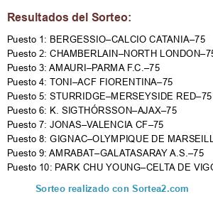 Lista de participantes: BERGESSIO–CALCIO CATANIA–75, K. SIGTHÓRSSON–AJAX–75, AMRABAT–GALATASARAY A.S.–75, STURRIDGE–MERSEYSIDE RED–75, JONAS–VALENCIA CF–75, TONI–ACF FIORENTINA–75, PARK CHU YOUNG–CELTA DE VIGO–75, AMAURI–PARMA F.C.–75, GIGNAC–OLYMPIQUE DE MARSEILLE–75, CHAMBERLAIN–NORTH LONDON–75.