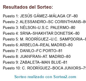 Lista de participantes: ZABALETA–MAN BLUE–81, DANILO–FC PORTO–81, ALESSANDRO–SC CORINTHIANS–80, M. RODRÍGUEZ–U.C. SAMPDORIA–80, JUANFRAN–AT. MADRID–80, NÉLSON–U.S.C. PALERMO–80, JESÚS GÁMEZ–MÁLAGA CF–80, ARBELOA–REAL MADRID–80, SRNA–SHAKHTAR DONETSK–80, C. RODRÍGUEZ–BOCA JUNIORS–79.
