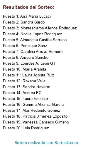 Lista de participantes: Sandra Martinez, Laura Escobar, Penelope Sanz, Coral Rubio, Daniel Labajo Diaz, Paco Naranjo, Almudena Castilla Serrano, Carolina Arroyo Romero, Vanessa Canseco Gimeno, Sandra Bardo, Elisangel Marques, Sandra Sandrilu, Rakel Alonso, Miriam Viejo Campo, Oscar Palacios Porrero, Mejia Alba, María Aranda, Maria Garcia Ramos, Montesclaros Allende Rodríguez, Andrea Roxana, Patricia Jimenez Exposito, Noelia Lopez Rodriguez, Susanita Alexandra, Sandra Fominaya Menendez, Gemma Atienza García, Santiago Cuervo Baños, Lola Rodriguez, Mar Redondo Gomez, Rosa Rivas, Andrea FC, Ana Maria Lucaci, Catalina Oana Ivanov, Amparo Sancho, Beatriz Molina Romero, Nuria Ponce Ponst, Gema Alonso López, Laura Acosta Ruiz, Mar Garcia Linares, Sandra Navarro, Ana Sanchez, Beatriz Paz, Anabel Clavero Hidalgo, Nayim Achor, Almudena Ruiz, Eva Ramos, Gema Ramos Martínez, Lourdes A. Leon Gil, Maria Eugenia Guerra Alvarez, Roxana Valle.