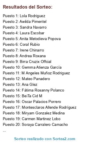 Lista de participantes: Susanita Alexandra, Irene Araque Criado, Fátima Rosanny Polanco, Sandra Fominaya Menendez, Vanessa Canseco Gimeno, MCarmen Bermejo Coello, Coral Rubio, Andrea Roxana, Merce Arevalo Cobos, Daniel Labajo Diaz, Miriam Viejo Campo, Miguel Martín Rodríguez, Sandra Sandrilu, Carolina Peral Gutiérrez, Sandra Bardo, Isabel López, Mar Redondo Gomez, Consu de la Torre, Lola Rodriguez, Chony Morena, Anita Metodieva Popova, María Aranda, Laura Torrado Cano, Maria Mya, Marisol Fernandez Terciado, Sandra Navarro, Esther Torrecilla Zarco, Alexandra Yo, Irene Chinarro, Soraya Carralero Camacho, Maria Jose Herrero Garcia, Rakel Alonso, Tamara Lj, Mirabela Onu, M Angeles Muñoz Rodriguez, Mateo Panadero, Elisangel Marques, Belen Garcia Martinez, Carolina Arroyo Romero, Da Getafe, Awilda Pimentel, Miryam Gonzalez Medina, Nadia Domingo Almagro, Selena CG, Laura Escobar, Birra Cruzix Offcial, Ana Glez, Annaescaparates Moda, Montesclaros Allende Rodríguez, Raquel González Fernández, Gemma Atienza García, Oscar Palacios Porrero, BeiTa Cid M, Catalina Oana Ivanov, Ruth Arenas Comeron, Lorena Garcia Bermudez, Carmen Martinez Lobo, Rosa Sanchez.