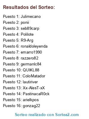 Lista de participantes: PastinacaR0ck, ColoMatador, arielkpos, germanlc84, seb89carp, Julimecano, ponii, QUIKL88, lautiriver, gonzag22, Xx-AlesT-xX, R9-Arg, Polilote, emarro1990, razzero82, ronaldoleyenda.