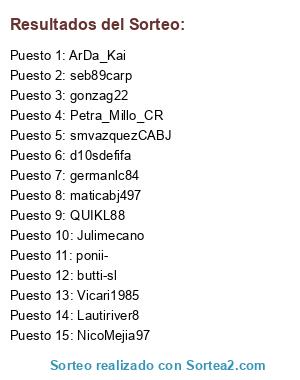 Lista de participantes: Nacocs, ANDRESLD5_BAC, zundeln, JuanMGonza, UruBrian, diegoSOADarg, Chicleso07, Nico-Bisceglia, Dormantooth04, ColoMatador, xgranTIGREx, fer_interlandi, francot_9, PastinacaR0ck, Thundersn4, arielkpos.