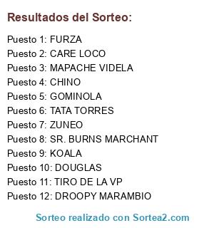 Lista de participantes: FURZA, SR. BURNS MARCHANT, ZUNEO, DROOPY MARAMBIO, GOMINOLA, CARE LOCO, CHINO, TIRO DE LA VP, DOUGLAS, TATA TORRES, MAPACHE VIDELA, KOALA.