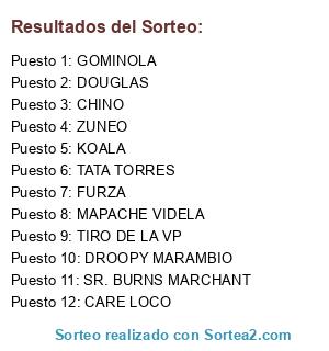 Lista de participantes: FURZA, GOMINOLA, CARE LOCO, CHINO, TIRO DE LA VP, DOUGLAS, ZUNEO, MAPACHE VIDELA, KOALA, SR. BURNS MARCHANT, TATA TORRES, DROOPY MARAMBIO.