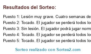 - Puesto 2: Tocado. El jugador se perderá todos los partidos de la siguiente semana.