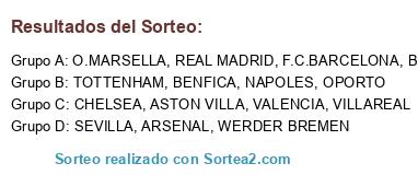 Lista de participantes: OPORTO, NAPOLES, F.C.BARCELONA, CHELSEA, BENFICA, BORUSSIA, O.MARSELLA, SEVILLA, VILLAREAL, REAL MADRID, WERDER BREMEN, TOTTENHAM, ARSENAL, VALENCIA, ASTON VILLA.