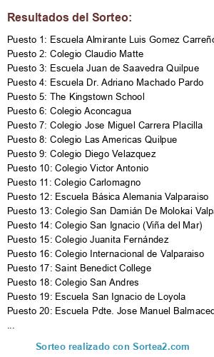 Lista de participantes: Escuela Paul Harris, Escuela Dr. Adolfo Tannenbaum, Escuela Libertador Bernardo O'higgins, Escuela Almirante Luis Gomez Carreño, Escuela Dr. Adriano Machado Pardo, Escuela Pdte. Jose Manuel Balmaceda, Colegio San Ignacio (Viña del Mar), Saint Benedict College, The Kingstown School, Colegio Claudio Matte, Colegio Diego Velazquez, Colegio Juanita Fernández, Colegio San Andres, Colegio Saint Dominic, Escuela Básica Alemania Valparaiso, Colegio Salesiano Valparaiso, Colegio Jose Miguel Carrera Placilla, Colegio Miguel de Unamuno Valparaiso, Colegio Internacional de Valparaiso, Escuela San Ignacio de Loyola, Colegio San Damián De Molokai Valparaíso, Colegio Victor Antonio, Escuela Juan de Saavedra Quilpue, Colegio Los Reyes Quilpue, Colegio Las Americas Quilpue, Colegio Aconcagua, Scuola Italiana Villa Alemana, Colegio Particular San Gabriel de La Rivera, Colegio Carlomagno, Colegio Winterhill.