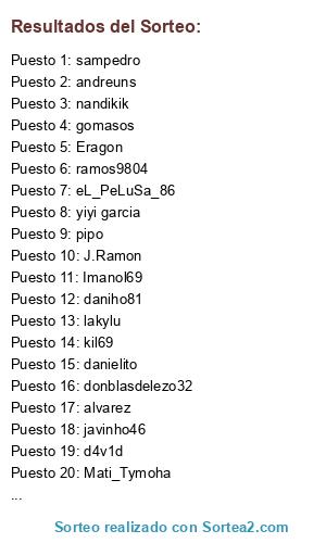 Lista de participantes: danielito, frias_01, daniho81, sampedro, nandikik, ramos9804, gomasos, flekis, porcelamus, alboton, kil69, Imanol69, Ermigui, donblasdelezo32, pipo, javinho46, d4v1d, ALF_66, lakylu, sanvifran, manucrack, andreuns, Mati_Tymoha, eL_PeLuSa_86, javitinho, alex, Eragon, J.Ramon, yiyi garcia, David, alvarez, Extremeitor.