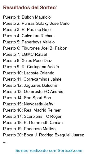 Lista de participantes: Scorpions FC Roger, The Warriors Šergio, Real Madrid Reimer, Pastores Pastor, R. Cartagena Adolfo, Newcastle Jefry, B. Dormundt Damian, Paperboys Vallejo, Poderoso Matteo, Calentura Richar, R. Paraiso Beto, Wolwerines Edwin, Winners U. Alvaro, Dubon Mauricio, Pumas Galaxy Jose Carlo, Jaguares Baluchis, Lacoste Orlando, Son Sport Son, Querrestu FC Andrés, LGMC Rafael, Xolos Paco Diaz, Raza Celeste Cazulo, Barranquilla Vanegas, Tiburones Joel B. Falcon, Boca J. Rodrigo Exequiel Juarez, Correcaminos Jaime.