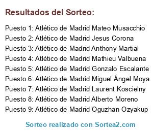Lista de participantes: Atlético de Madrid Miguel Ángel Moya, Atlético de Madrid Marcel Schmelzer, Atlético de Madrid Dani Alves, Atlético de Madrid Laurent Koscielny, Atlético de Madrid Alberto Moreno, Atlético de Madrid Oguzhan Ozyakup, Atlético de Madrid Mateo Musacchio, Atlético de Madrid Renato Sánches, Atlético de Madrid José Callejón, Atlético de Madrid Oliver Torres, Atlético de Madrid Giorgio Chiellini, Atlético de Madrid Mario Gaspar, Atlético de Madrid Anthony Martial, Atlético de Madrid Jesus Corona, Atlético de Madrid Mathieu Valbuena, Atlético de Madrid Firmino, Atlético de Madrid Giovinco, Atlético de Madrid Koke Resurrección, Atlético de Madrid Gonzalo Escalante, Atlético de Madrid Mariano Díaz, Atlético de Madrid Memphis Depay, Atlético de Madrid Lass Diarra, Atlético de Madrid Thibaut Courtois, Atlético de Madrid Moussa Marega.