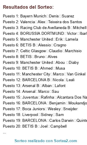 Lista de participantes: AC Milán Rafael Silva, AC Milán Jeremy Mathieu, AC Milán Pedro Rodriguez Ledesma, AC Milán Mauro Zarate, AC Milán Younés Kaboul, AC Milán Nani, AC Milán Soldado, AC Milán Sven Bender, AC Milán Donis Avdijaj, AC Milán Andrés Guardado, AC Milán Christian Benteke, AC Milán Jan Vertonghen, AC Milán Stefan De Vrij, AC Milán Kevin Volland, AC Milán Bojan Krkic, AC Milán Kevin Mirallas, AC Milán Fabinho, AC Milán Asmir Begovic, AC Milán Tim Krul, AC Milán Ashley Cole, AC Milán Nacho Monreal, AC Milán Cesar Azpilicueta, AC Milán Ivan Perisic, ACF FIORENTINA Dani Parejo, ACF FIORENTINA Julio Buffarini, ACF FIORENTINA Maxime Gonalons, ACF FIORENTINA Thiago Motta, ACF FIORENTINA Anthony Martial, ACF FIORENTINA Jesus Gamez, ACF FIORENTINA Juan Bernat, ACF FIORENTINA Cristian Zapata, ACF FIORENTINA Zakaria Bakkali, ACF FIORENTINA Roberto Firmino, ACF FIORENTINA José Callejón, ACF FIORENTINA Aymeric Laporte, ACF FIORENTINA Franck Ribery, ACF FIORENTINA Burak Yilmaz, ACF FIORENTINA Claudio Bravo, ACF FIORENTINA Mario Mandzukic, ACF FIORENTINA Kevin Strootman, ACF FIORENTINA Roman Burki, ACF FIORENTINA Bernardo Espinosa, ACF FIORENTINA Timo Horn, ACF FIORENTINA Javier Mascherano, ACF FIORENTINA Heung-Min Son, ACF FIORENTINA Naldo, ACF FIORENTINA Alexandre Lacazette, ACF FIORENTINA Gerard Deulofeu, ACF FIORENTINA B Denizhan Deniz, ACF FIORENTINA B Yossuf Poulsen, ACF FIORENTINA B Antonio Sanabria, ACF FIORENTINA B Godfred Donsah, ACF FIORENTINA B Frederik Sorensen, ACF FIORENTINA B Jonathan Tah, ACF FIORENTINA B Borja Lopez, ACF FIORENTINA B Fraser Kerr, ACF FIORENTINA B Jorge Mere Perez, ACF FIORENTINA B Pedro Obiang, ACF FIORENTINA B Diego Jota, ACF FIORENTINA B Felix Passlack, ACF FIORENTINA B Adam Armstrong, ACF FIORENTINA B Juan Muñiz, ACF FIORENTINA B Rey Manaj, ACF FIORENTINA B Lass Bangoura, ACF FIORENTINA B Gabriel Castellon, ACF FIORENTINA B Leandrinho, ACF FIORENTINA B Alex Serrano, ACF FIORENTINA B Pablo Perez, ACF FIORENTINA B Carlos Castro, Alax de Asterdam Paul Pogba, Alax de Asterdam Philippe Mexes, Alax de Asterdam Tino Costa, Alax de Asterdam Memphis Depay, Alax de Asterdam Joe Hart, Alax de Asterdam Jeremy Toulalan, Alax de Asterdam Jerome Boateng, Alax de Asterdam Diogo Figueiras, Alax de Asterdam Maxime Lestienne, Alax de Asterdam Daniele Verde, Alax de Asterdam Kingsley Coman, Alax de Asterdam Manolo Gabbiadini, Alax de Asterdam Patrice Evra, Alax de Asterdam Simone Zaza, Alax de Asterdam Jeremy Menez, Alax de Asterdam Diego Benaglio, Alax de Asterdam Sergio Ramos, Alax de Asterdam Seamus Coleman, Alax de Asterdam Zatlan Ibrahimovic, Alax de Asterdam Douglas Costa, Alax de Asterdam Raul Meireles, Arsenal Andrea Barzagli, Arsenal Mauricio Isla, Arsenal Frank Fabra, Arsenal Karim Bellarabi, Arsenal Victor Obinna, Arsenal Cheikhou Kouyate, Arsenal Daniele Baselli, Arsenal Paul-Georges Ntep, Arsenal Stefan Radu, Arsenal Yacine Brahimi, Arsenal Maicon, Arsenal Jefferson Farfán, Arsenal Marlos Romero Bonfim, Arsenal Marco Sau, Arsenal Tongo Doumbia, Arsenal Alexandre Pato, Arsenal Julio Cesar, Arsenal Bruno Peres, Arsenal Manuel Fernandes, Arsenal Nordin Amrabat, Arsenal Alisson Ramses Becker, Arsenal Federico Mancuello, Arsenal Darlington Nagbe, Arsenal Jetro Willems, Arsenal B Alban Lafont, Arsenal B Edmilson Junior, Arsenal B Jeisson Vargas, Arsenal B Solomon Kverkvelia, Arsenal B Josh Onomah, ATLÉTICO MADRID Wellington Silva, ATLÉTICO MADRID Vicente Guaita, ATLÉTICO MADRID Derick Tshimanga, ATLÉTICO MADRID Laurent Koscielny, ATLÉTICO MADRID Gonzalo Higuain, ATLÉTICO MADRID Raheem Sterling, ATLÉTICO MADRID Yannick Ferreira carrasco, ATLÉTICO MADRID Jesus Corona, ATLÉTICO MADRID Gervinho Yao, ATLÉTICO MADRID Moussa Marega, ATLÉTICO MADRID Marcel Schmelzer, ATLÉTICO MADRID Philippe Coutinho, ATLÉTICO MADRID Moussa Sissoko, ATLÉTICO MADRID Javi Martinez, ATLÉTICO MADRID Georginio Wijnaldum, ATLÉTICO MADRID Jorginho, ATLÉTICO MADRID James Milner, ATLÉTICO MADRID Michel Macedo, ATLÉTICO MADRID Mohammed Al Sahlawi, ATLÉTICO MADRID Mateo Musacchio, ATLÉTICO MADRID Thibaut Courtois, ATLÉTICO MADRID Thomas Muller, ATLÉTICO MADRID Xabi Alonso, BARCELONA Lars Stindl, BARCELONA Sergio Busquets, BARCELONA Nicolas Gaitan, BARCELONA Yohan Cabaye, BARCELONA Nathaniel Clyne, BARCELONA Benjamin Moukandjo, BARCELONA Konstantinos Manolas, BARCELONA Cristian Ansaldi, BARCELONA Aymen Abdennour, BARCELONA Cristian Eriksen, BARCELONA Stephane Ruffier, BARCELONA Carlos Darwin Quintero, BARCELONA Carlos Vela, BARCELONA Luis Suarez, BARCELONA Jese Rodriguez, BARCELONA Adem Ljajic, BARCELONA Gary Cahill, BARCELONA Granit Xhaka, BARCELONA Fabian Orellana, BARCELONA Simon Mignolet, BARCELONA Nicolas N'koulou, BARCELONA B Stefano Denswil, BARCELONA B Thorgan Hazard, BARCELONA B Mitchell Weiser, BARCELONA B Diego Reyes, BARCELONA B Isaac Success, BARCELONA B Horrit Hendrix, BARCELONA B Youri Tielemans, BARCELONA B Joshua Kimmich, BARCELONA B Julian Weigl, BARCELONA B Ahmed Hassan, BARCELONA B Jesse Lingard, BARCELONA B Josef Martinez, BARCELONA B Chuba Akpom, BARCELONA B Adnan Januzaj, BARCELONA B Marcos Lopes, BARCELONA B Mory Kone, BARCELONA B Seko Fofana, BARCELONA B Nathan Redmond, BARCELONA B Angel Correa, BARCELONA B Adrien Rabiot, BARCELONA B Calum Chambers, BARCELONA B Pione Sisto, BARCELONA B Nicola Leali, BARCELONA B Raphael Guerreiro, Bayern Leverkusen Jose Vazquez, Bayern Leverkusen Jonas, Bayern Leverkusen Steve Mandanda, Bayern Leverkusen Shinji Kagawa, Bayern Leverkusen Andoni Iraola, Bayern Leverkusen Giuseppe Rossi, Bayern Leverkusen Jerry Akaminko, Bayern Leverkusen Patrick Herrmann, Bayern Leverkusen Rasmus Elm, Bayern Leverkusen Alberto Lora, Bayern Leverkusen Arturo Vidal, Bayern Leverkusen Victor Valdes, Bayern Leverkusen Thiago Alcantara, Bayern Leverkusen Marvell Wynne, Bayern Leverkusen Juan Manuel Mata, Bayern Leverkusen Miguel Layun, Bayern Munich Denis Suarez, Bayern Munich Gaucho Ronaldinho, Bayern Munich Gerard P