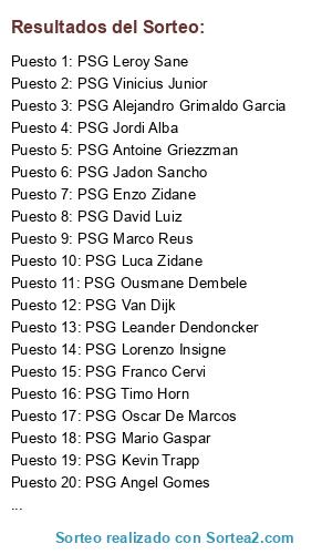 Lista de participantes: PSG Van Dijk, PSG Kevin Trapp, PSG Leroy Sane, PSG Jordi Alba, PSG David Luiz, PSG Angel Gomes, PSG Gerard Deulofeu, PSG Franco Cervi, PSG Timo Horn, PSG Marco Reus, PSG Antoine Griezzman, PSG Enzo Zidane, PSG Luca Zidane, PSG Jadon Sancho, PSG Alexandre Lacazette, PSG Ousmane Dembele, PSG Oscar De Marcos, PSG Alejandro Grimaldo Garcia, PSG Vinicius Junior, PSG Mario Gaspar, PSG Leander Dendoncker, PSG Timo Werner, PSG Lorenzo Insigne, PSG Gary Medel.