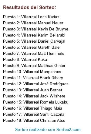 Lista de participantes: Villarreal Romelu Lukaku, Villarreal Juan Bernat, Villarreal Matt Hummels, Villarreal Jack Wilshere, Villarreal Jesé Rodríguez, Villarreal Santi Cazorla, Villarreal Kaká, Villarreal Daniel Carvajal, Villarreal Kevin De Bruyne, Villarreal Christian Atsu, Villarreal Manuel Neuer, Villarreal Matthias Ginter, Villarreal Loris Karius, Villarreal Frank Ribery, Villarreal Gareth Bale, Villarreal Thiago Maia, Villarreal Karim Bellarabi, Villarreal Marquinhos.