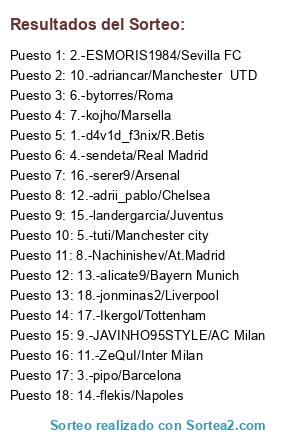 Lista de participantes: 1.-d4v1d_f3nix/R.Betis, 2.-ESMORIS1984/Sevilla FC, 3.-pipo/Barcelona, 4.-sendeta/Real Madrid, 5.-tuti/Manchester city, 6.-bytorres/Roma, 7.-kojho/Marsella, 8.-Nachinishev/At.Madrid, 9.-JAVINHO95STYLE/AC Milan, 10.-adriancar/Manchester UTD, 11.-ZeQuI/Inter Milan, 12.-adrii_pablo/Chelsea, 13.-alicate9/Bayern Munich, 14.-flekis/Napoles, 15.-landergarcia/Juventus, 16.-serer9/Arsenal, 17.-Ikergol/Tottenham, 18.-jonminas2/Liverpool.