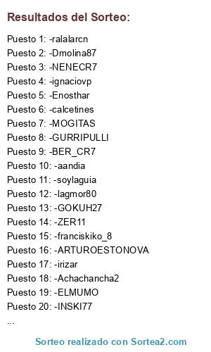 Lista de participantes: -lagmor80, -INSKI77, -linares35, -EDU_MB1, -irizar, -ralalarcn, -ignaciovp, -Enosthar, -aandia, -NENECR7, -nefertari26, -EHB_KIKE, -RECOBA20, -soylaguia, -ELMUMO, -ELOSKARON, -GURRIPULLI, -MOGITAS, -ZER11, -ARTUROESTONOVA, -reywwf619, -franciskiko_8, -BER_CR7, -GOKUH27, -Roberto_69_89, -Achachancha2, -calcetines, -Dmolina87, -victor89, -MARIO_LR.