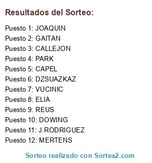 Lista de participantes: DZSUAZKAZ, DOWING, GAITAN, PARK, CAPEL, ELIA, REUS, JOAQUIN, CALLEJON, MERTENS, VUCINIC, J.RODRIGUEZ.