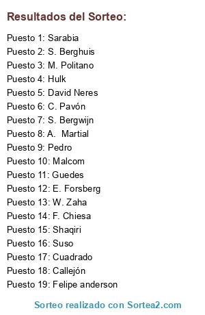 Lista de participantes: Hulk, Callejón, Pedro, Shaqiri, Cuadrado, Sarabia, Felipe anderson, S. Berghuis, Suso, A. Martial, W. Zaha, M. Politano, Malcom, E. Forsberg, S. Bergwijn, C. Pavón, Guedes, F. Chiesa, David Neres.