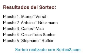 Lista de participantes: Simon Mignolet, Stephane Ruffier, Nicolas Gaitan, Cristian Eriksen, Granit Xhaka, Paul Pogba, Yohan Cabaye, Cristian Ansaldi, Jesus Gamez, Nathaniel Clyne, Antoine Griezmann, Taison Barcellos Freda, Carlos Vela, Nicolas N'koulou, Aymen Abdennour, Gary Cahill, Carlos Bacca, Carlos Darwin Quintero, Oscar dos Santos, Marco Verratti.