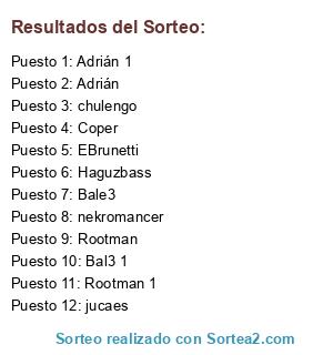 Lista de participantes: chulengo, Adrián, Adrián 1, nekromancer, Haguzbass, EBrunetti, Coper, jucaes, Rootman, Rootman 1, Bale3, Bal3 1.