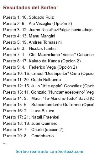 Lista de participantes: 1. Cte. Maximiliano "Vassili" Cabanne (Opción 2), 2. Luca Buluca , 3. Nicolas Fantini, 4. Federico Vega (Opción 2), 5. Subcomandante Guillermo (Opción 2), 6. Ale Visciglio (Opción 2), 7. Churlo (opcion 2), 8. Gordobarrio, 9. Mauri "Te-Mancho-Todo" Savid (Opción 2), 10. Soldado Ruiz, 11. Gonzalo "Nuncamedespeino" Vega, 12. Juano NinjaPazPulgar hacia abajo (Opción 2), 13. Manu Mangini, 14. Waldo "tripode" Herrera (Opción 2), 15. Julio "little apple" González (Opción 2), 16. Ernest "Destripeitor" Cima (Opcion 2), 17. Kakao da Kanoa (Opcion 2), 18. Juan Quintero, 19. Andres Tomassini, 20. Guido Balbuena, 21. Natali Fraenkel, .